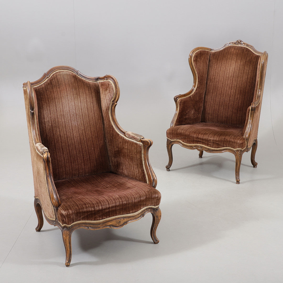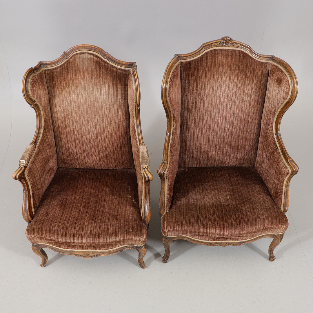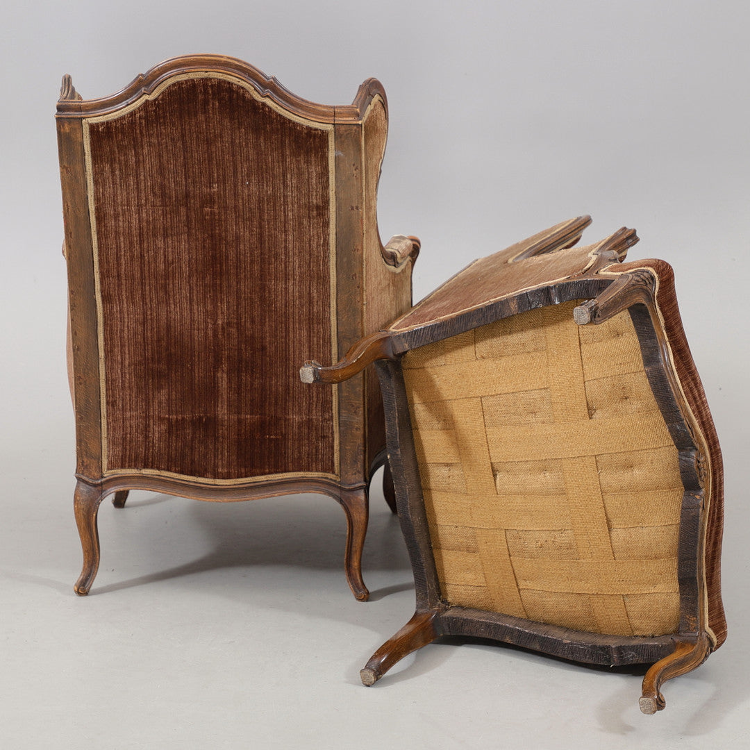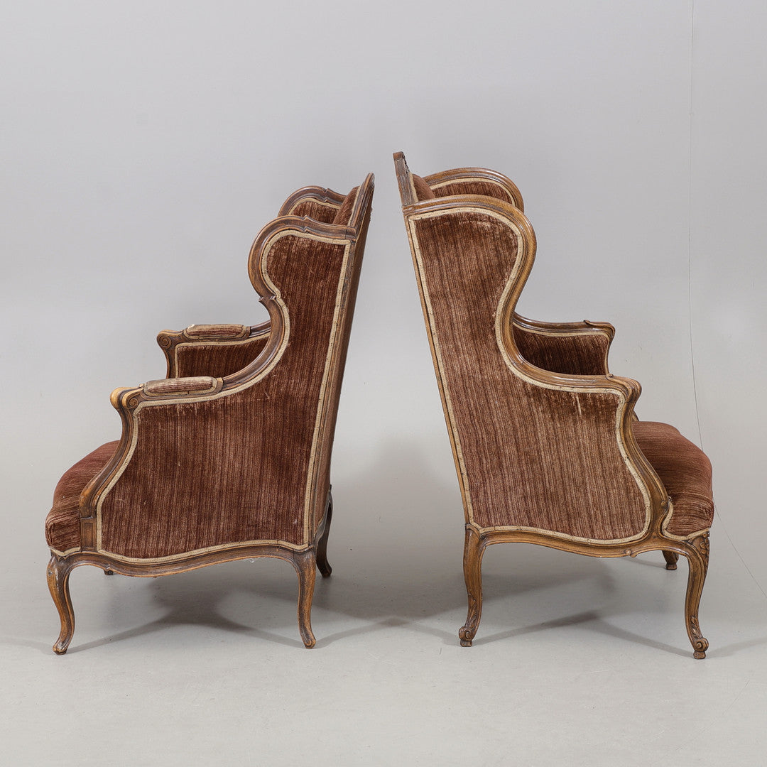 Ett par bergèrefåtöljer i rokokostil från 1900-talets första hälft. Klädda i en elegant brun ton och med snarlik utformning. De mjuka formerna och det klassiska uttrycket gör dem till ett charmigt och tidstypiskt inslag i rummet..