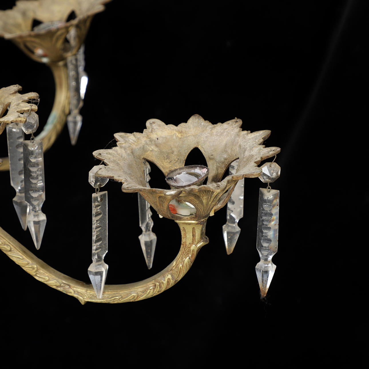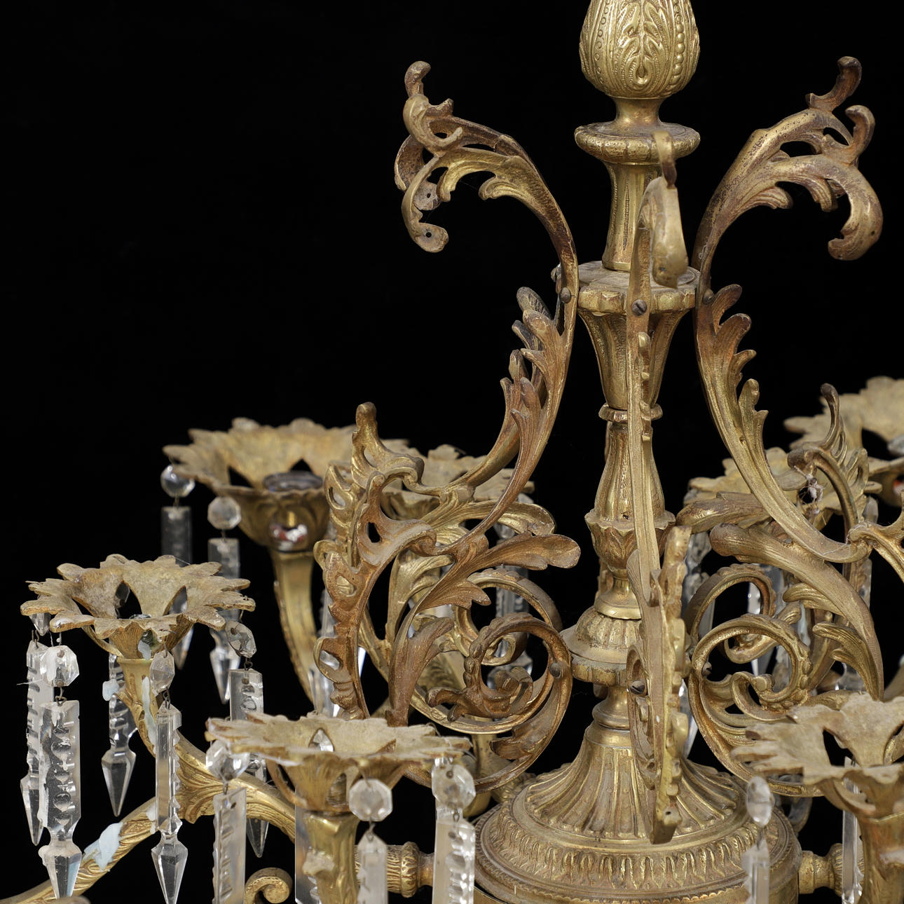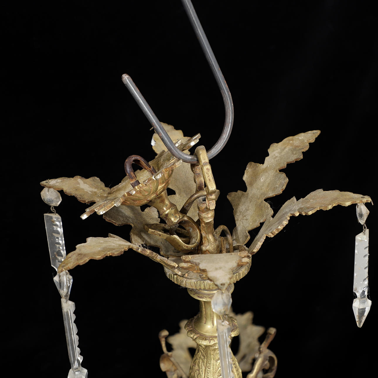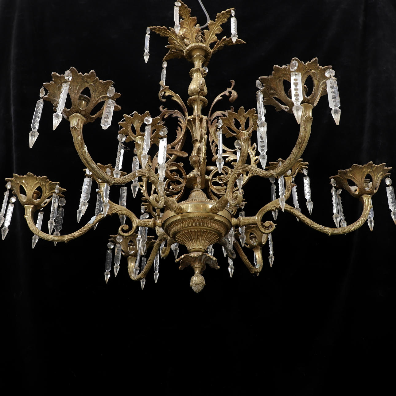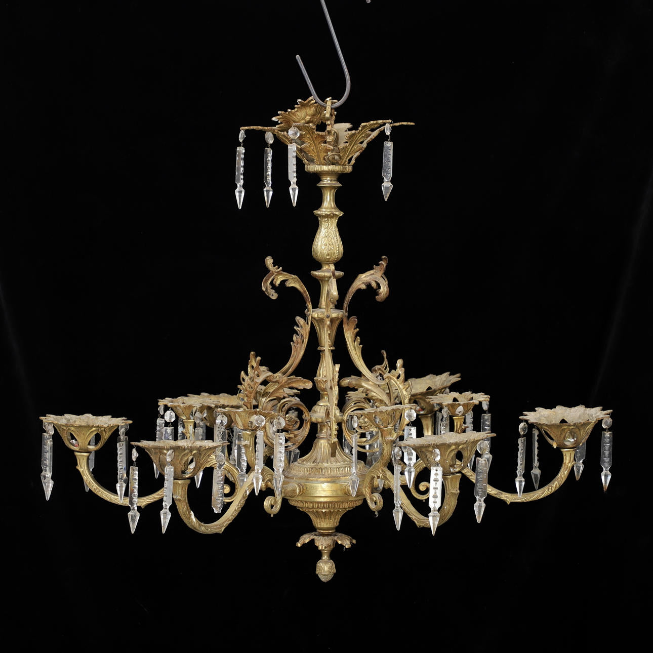 Elegant ljuskrona i mässing med gnistrande prismor från tidigt 1900-tal. Ett tidstypiskt och stämningsfullt blickfång som förgyller varje rum med sin charm och karaktär.