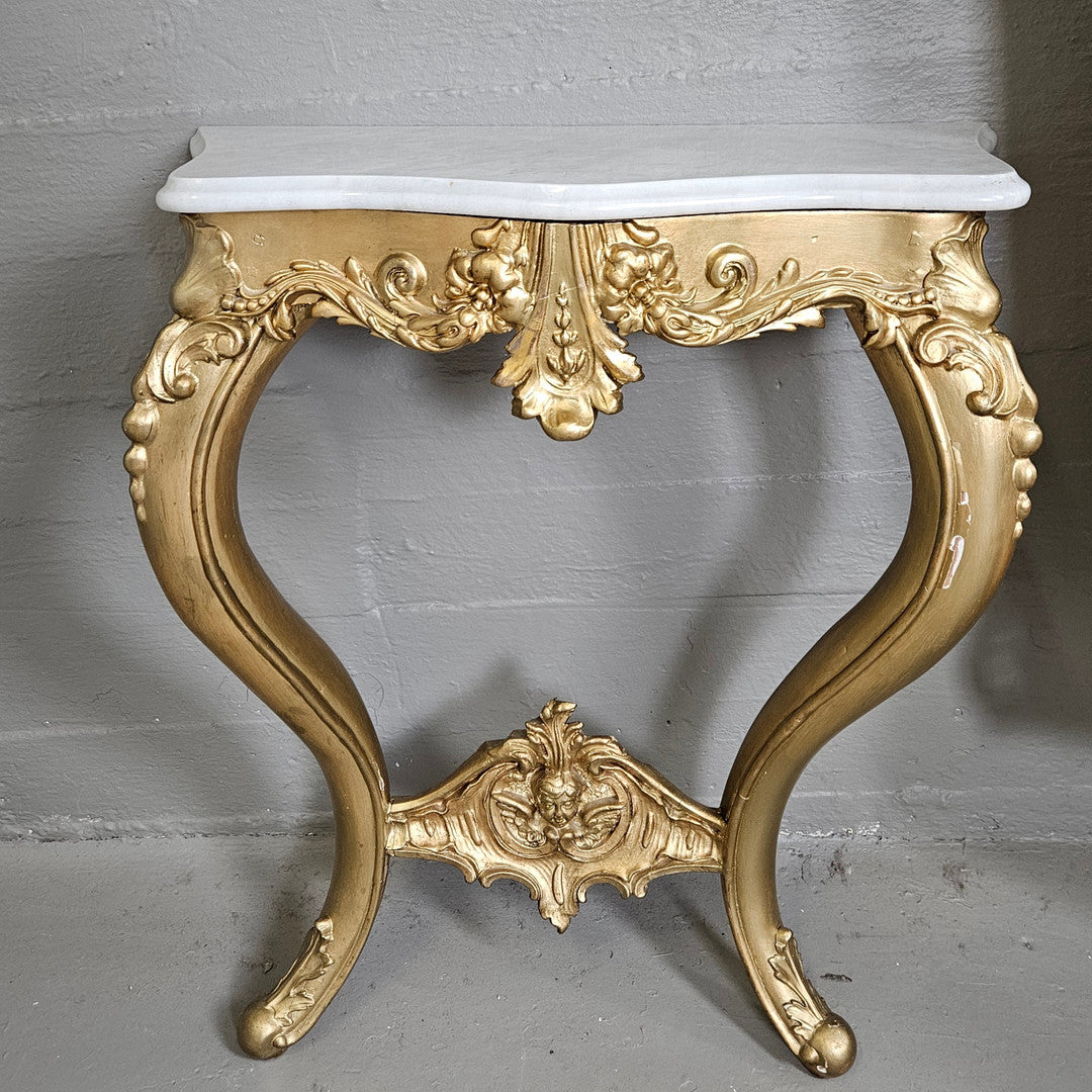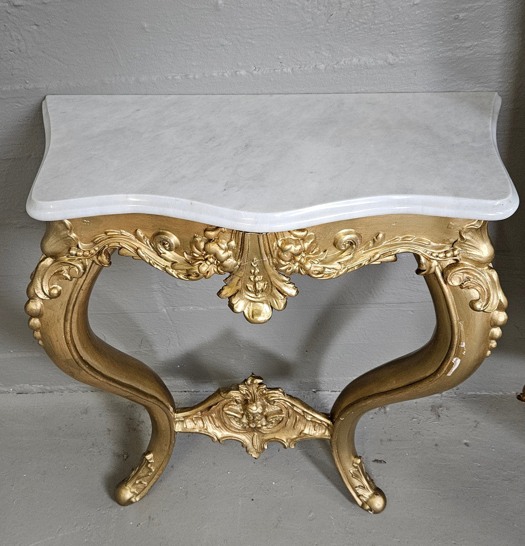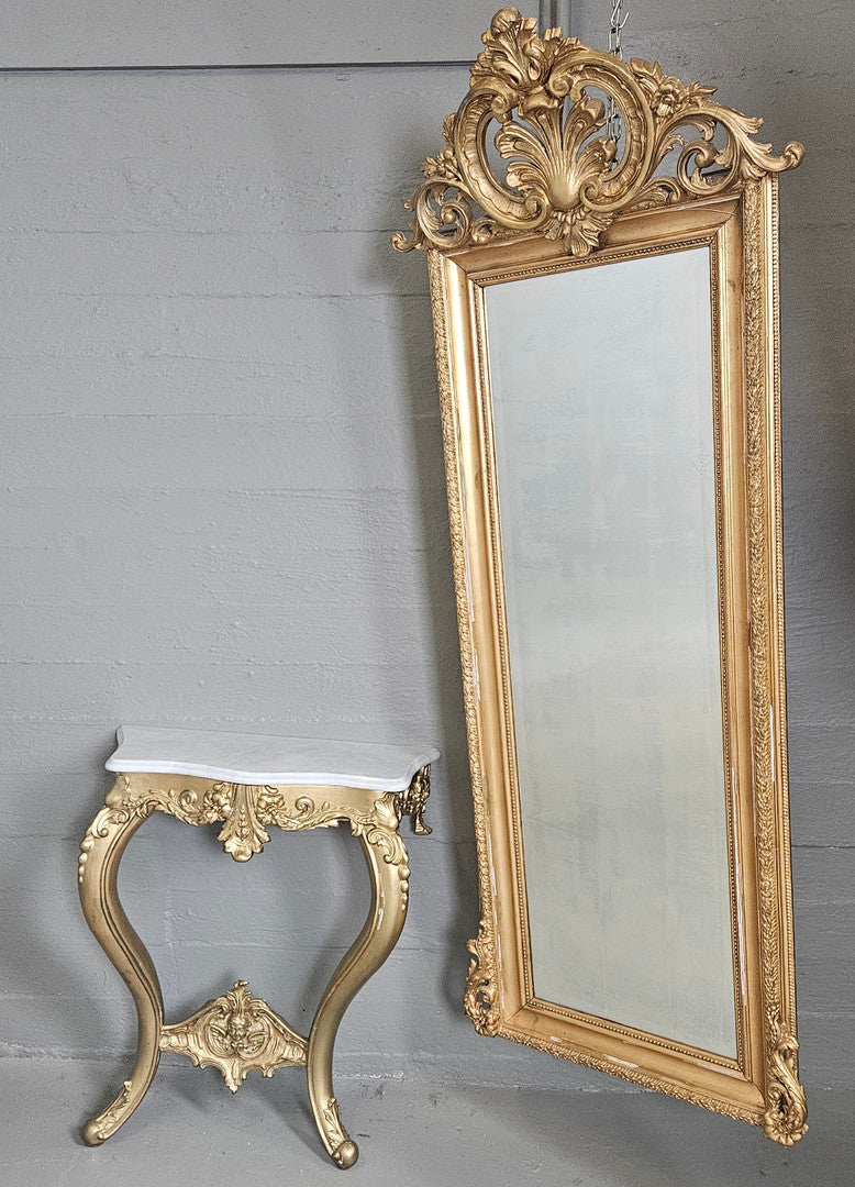 Spegel med trymåbord i nyrokoko från sent 1800-tal – ett vackert exempel på tidens eleganta design med mjuka, böljande former och dekorativa detaljer. Perfekt som en stilfull blickfångare i hallen eller vardagsrummet..