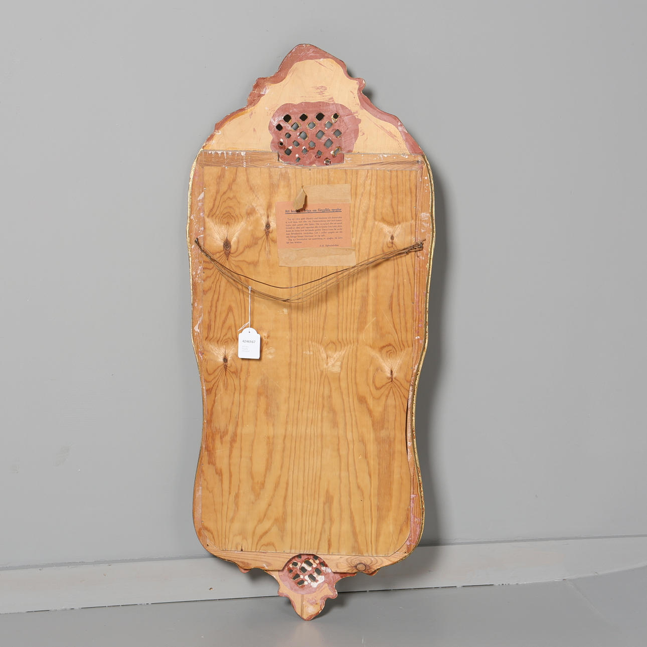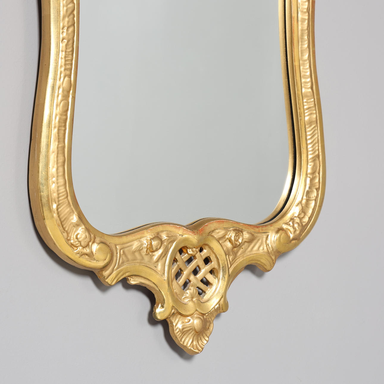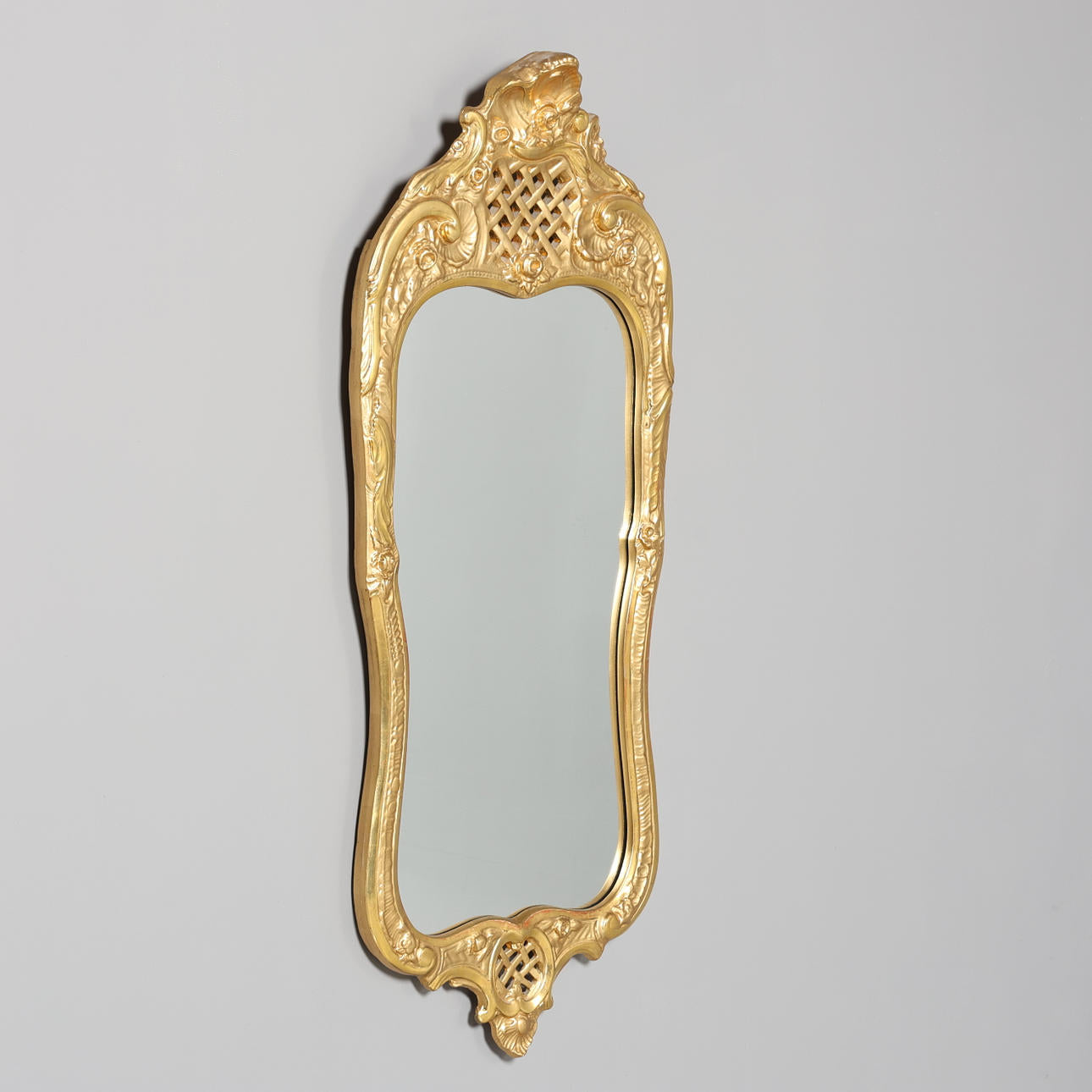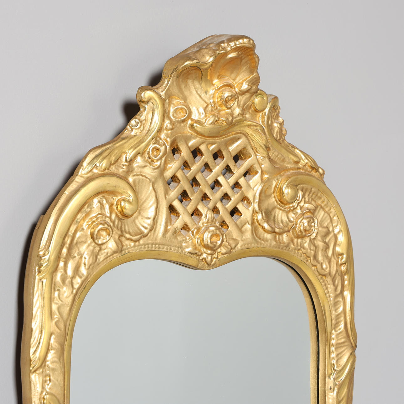 Praktfull förgylld spegel i rokokostil – en dekorativ inredningsdetalj som för tankarna till svunna epoker. De sirligt skulpterade formerna och den gyllene ytan ger rummet en elegant och tidlös karaktär.